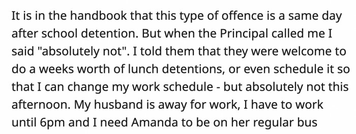OP and her husband are working, which means Amanda would have to take the bus. Due to the afterschool detention, she would have to go on a much later bus that would drop her off a mile away from their house.