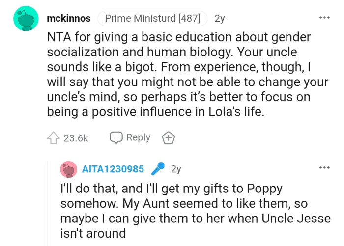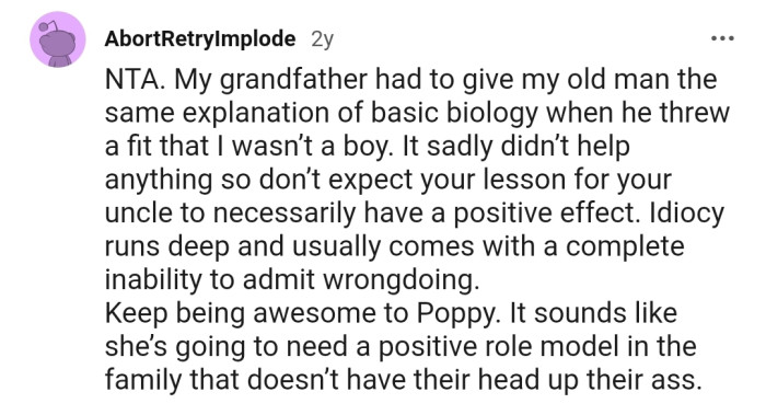 The response from the Reddit community was overwhelming, with Redditors applauding OP for challenging gender stereotypes and educating their uncle about chromosomes.