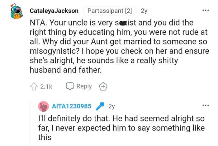 "NTA. Your uncle is very sexist and you did the right thing by educating him"