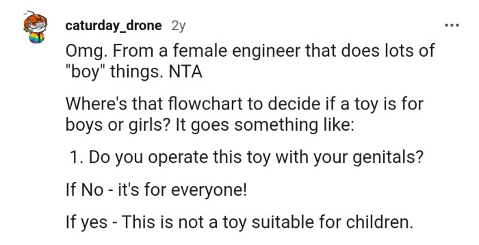 In a world where gender stereotypes are being challenged, one Redditor found themselves caught in a heated debate over the so-called appropriateness of toys. Meet our narrator (Original Poster), an enthusiastic gift-giver who recently experienced a bewildering encounter with their uncle (Jesse) that has caused a stir within the family.
