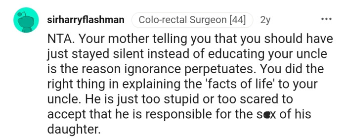 Reddit.comOP's uncle then made a statement insinuating that having a daughter is his wife's fault