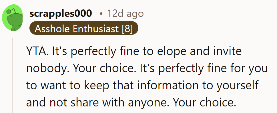 They might feel excluded or think that their relationship with the person isn't as close as they believed. It's understandable why someone might choose to elope and keep it private, but it's also reasonable for friends to feel upset if they discover this secret years later.