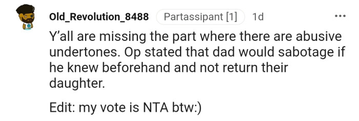 "NTA...Y’all are missing the part where there are abusive undertones"