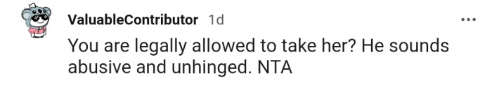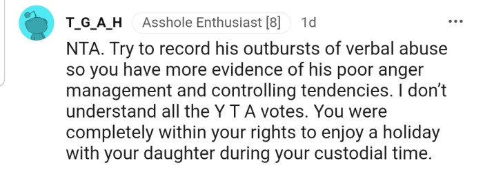 In addition, some Redditors have declared that OP's ex has anger issues, which is dangerous for their daughter. In fact, one Redditor advised her to sue for verbal abuse.