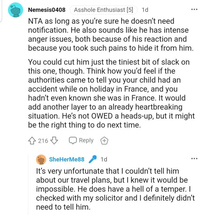 The commenters have rallied behind OP on this matter. The overwhelming majority believe that she is well within her rights to take their daughter on vacation without his permission.