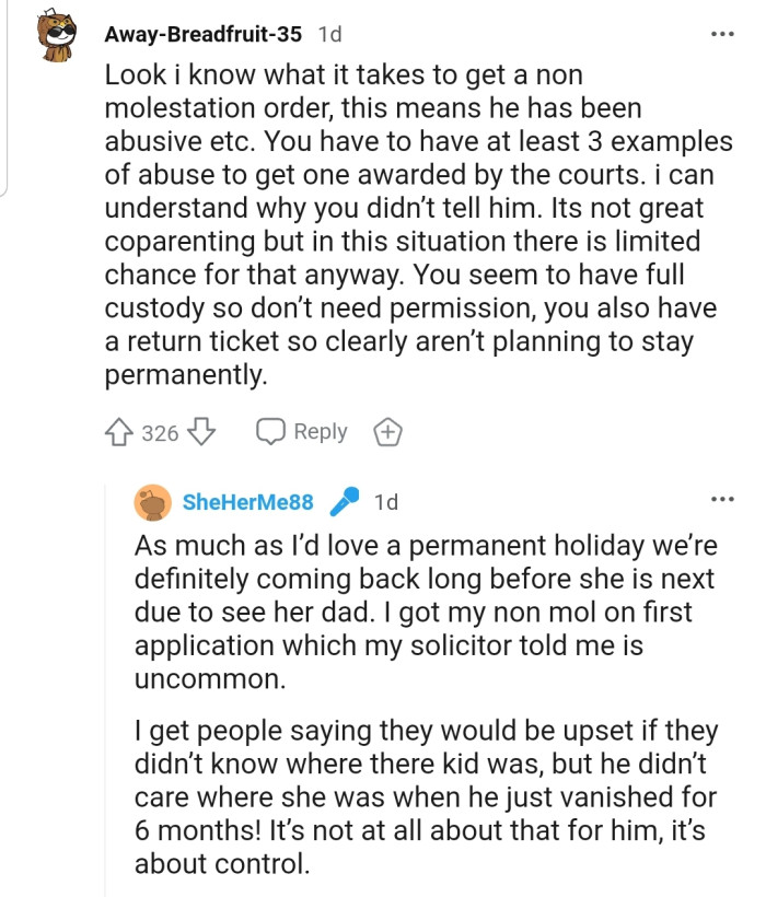 OP responded with a measured message, assuring her ex that they were on holiday and would return before his visitation was due. But that wasn't enough to convince him, and now he has threatened to sue unless she returns immediately.