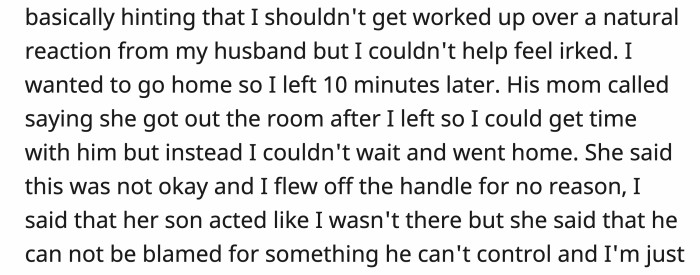 Sometime later, her mother-in-law called her, saying she had stepped out of the room early to give OP a chance to see her husband, but she was nowhere to be found. The mother-in-law said this was not okay and that OP was acting too extremely for no apparent reason.