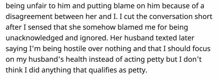 The unreasonable wife ended the call after hearing that because she felt like she was being blamed for being unacknowledged and ignored—her words, not ours. Later that day, OP's father-in-law messaged her, saying she was being hostile over nothing and advised OP to focus on her husband's health instead of acting petty.