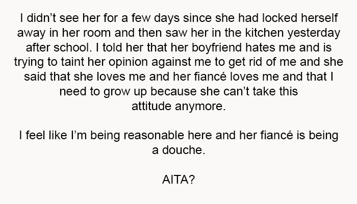 After reviewing the story and hearing from others, what do you think? Is the teenager justified in her feelings towards her sister's fiancé, or are there ways she could better handle the situation to ease the household tension?