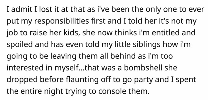 She said it's not her responsibility to raise her siblings. Their mum thinks OP is entitled and spoiled for thinking this way.