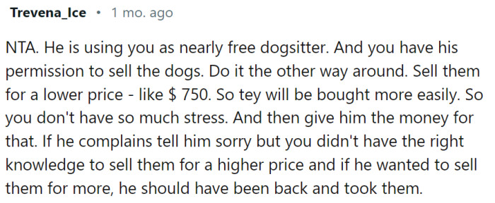 I didn’t really want to sell the dogs. That just seems like even more work, but I wanted to make a point, and after this and my aunt calling me out, I kind of feel like I should.The cousin's apparent disregard for both the agreed-upon terms and the Redditor's repeated pleas for clarity added fuel to an already tense situation. The lesson here? When mixing family and business, always set clear terms, and don't be afraid to stand your ground when those terms are breached.