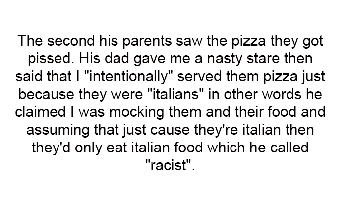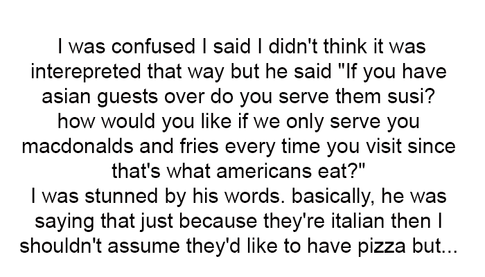 Her boyfriend's father perceived the gesture as a cultural slight, accusing her of mocking their heritage by assuming Italians only eat pizza. He compared it to serving sushi to Asian guests or fast food to Americans, which left her stunned.