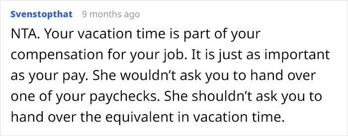 In this case, the woman's refusal to give vacation days can be seen as a boundary-setting measure, emphasizing her need to prioritize her own well-being.