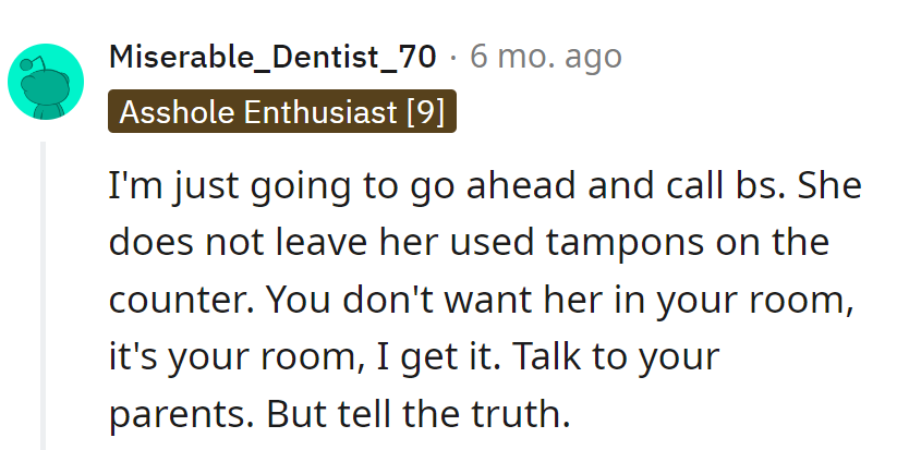 "She also leaves her bloody tampons on the counter in our bathroom and says she forgets to throw them out."