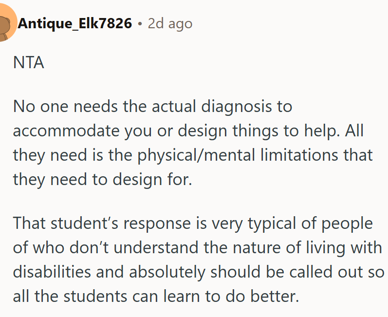 This situation highlights how deeply personal experiences shape our interactions, especially around sensitive topics like disability. The student's insistence on a diagnosis reflects a common tendency to seek labels for understanding, which can unintentionally dismiss the nuances of individual experiences. OP's choice to focus on barriers rather than labels emphasizes the importance of advocating for needs while maintaining personal boundaries—something we all should be mindful of in fostering respectful and inclusive dialogue.