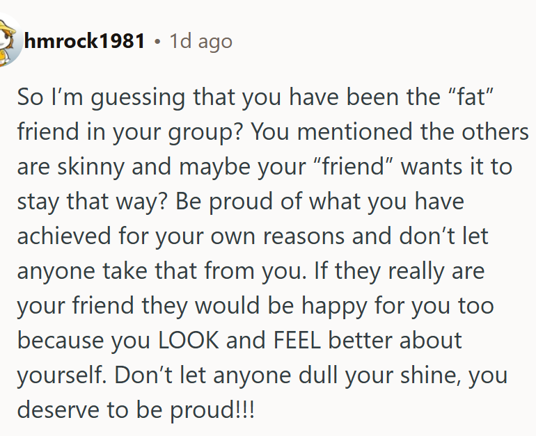 In conclusion, the interplay between personal achievements and social perceptions can complicate how milestones are celebrated. The reactions from friends in this scenario underscore the importance of understanding the emotional triggers related to body image and weight.