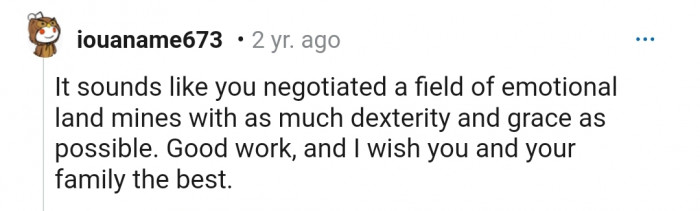"It sounds like you negotiated a field of emotional land mines with as much dexterity and grace as possible."