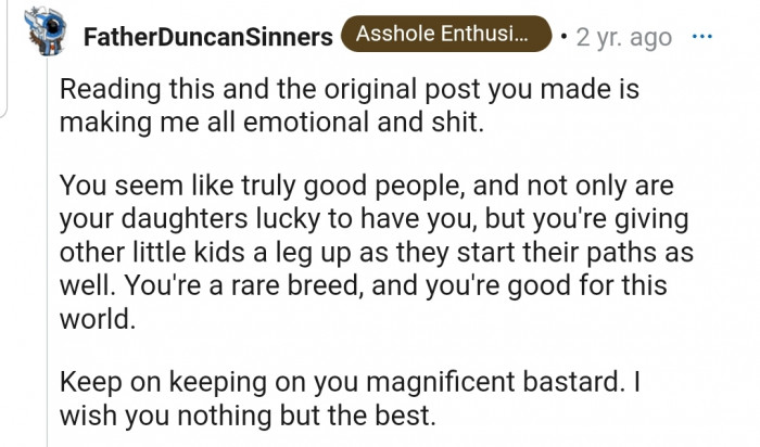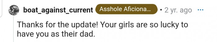 "Thank you for being truthful and ultimately being there for your daughters. 10/10 dad skills :)"
