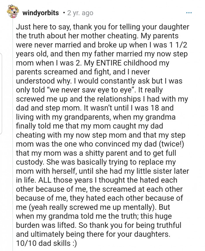 OP also shared that this scenario led to his oldest daughter questioning him about her mom's cheating escapades. He admitted this was difficult to answer, as he didn't want to sever the girls' relationship with their mom.