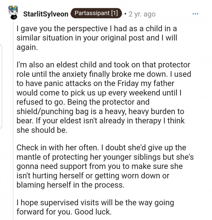 "I hope supervised visits will be the way going forward for you. Good luck."