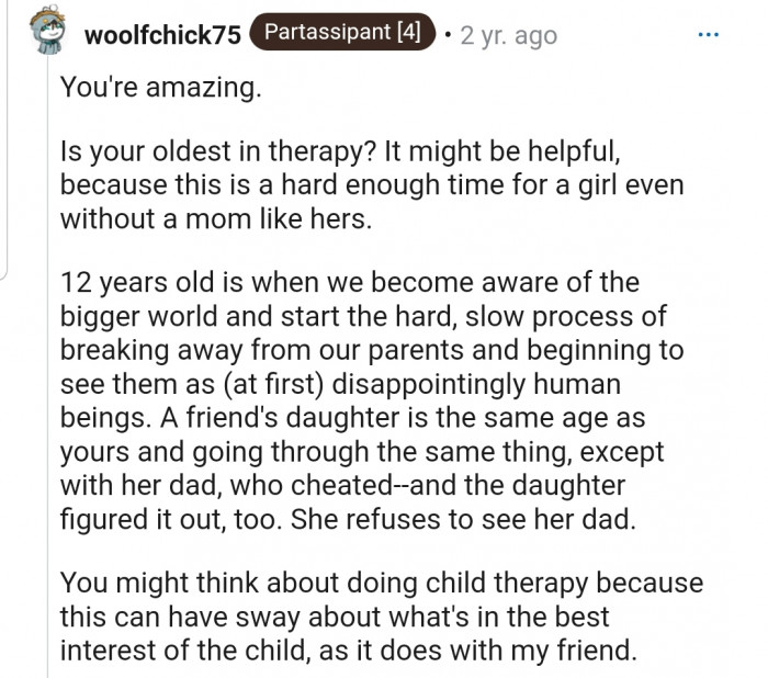 "Is your oldest in therapy? It might be helpful, because this is a hard enough time for a girl even without a mom like hers."