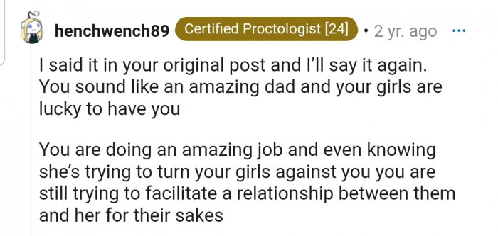 "You are doing an amazing job and even knowing she’s trying to turn your girls against you you are still trying to facilitate a relationship between them and her for their sakes"