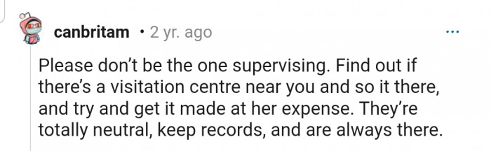 "Please don’t be the one supervising. Find out if there’s a visitation center near you and so it there, and try and get it made at her expense."