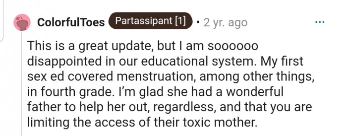 "This is a great update, but I am soooooo disappointed in our educational system. My first sex ed covered menstruation, among other things, in fourth grade."