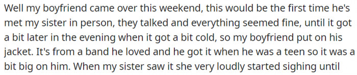 She complains about clothing stores not selling larger sizes, sugary foods costing more than plain food, and all that nonsense. Well, it got to a point when she attacked the OP’s boyfriend for buying a big jacket when he was clearly skinny.