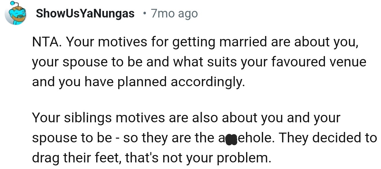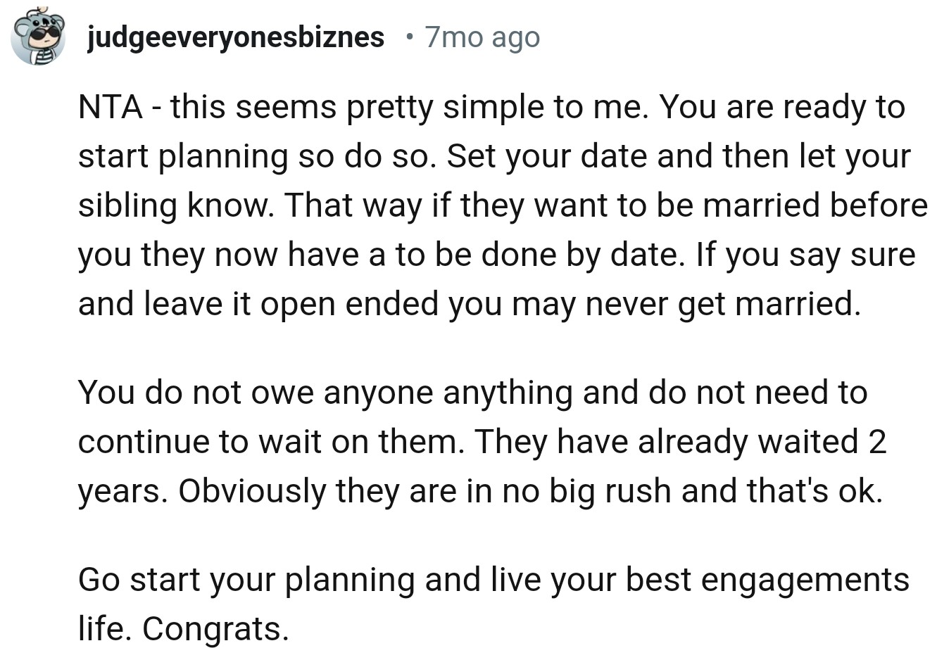 "You shouldn't have to put your wedding on hold because your sibling hasn't planned his yet"