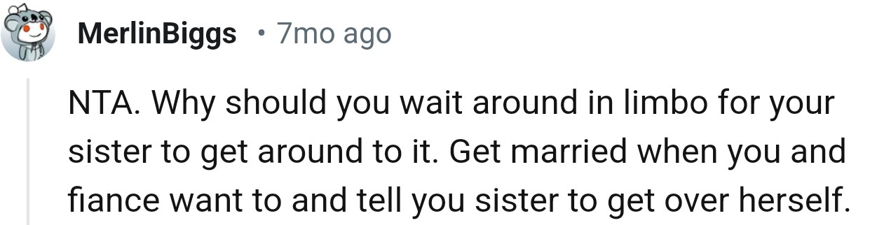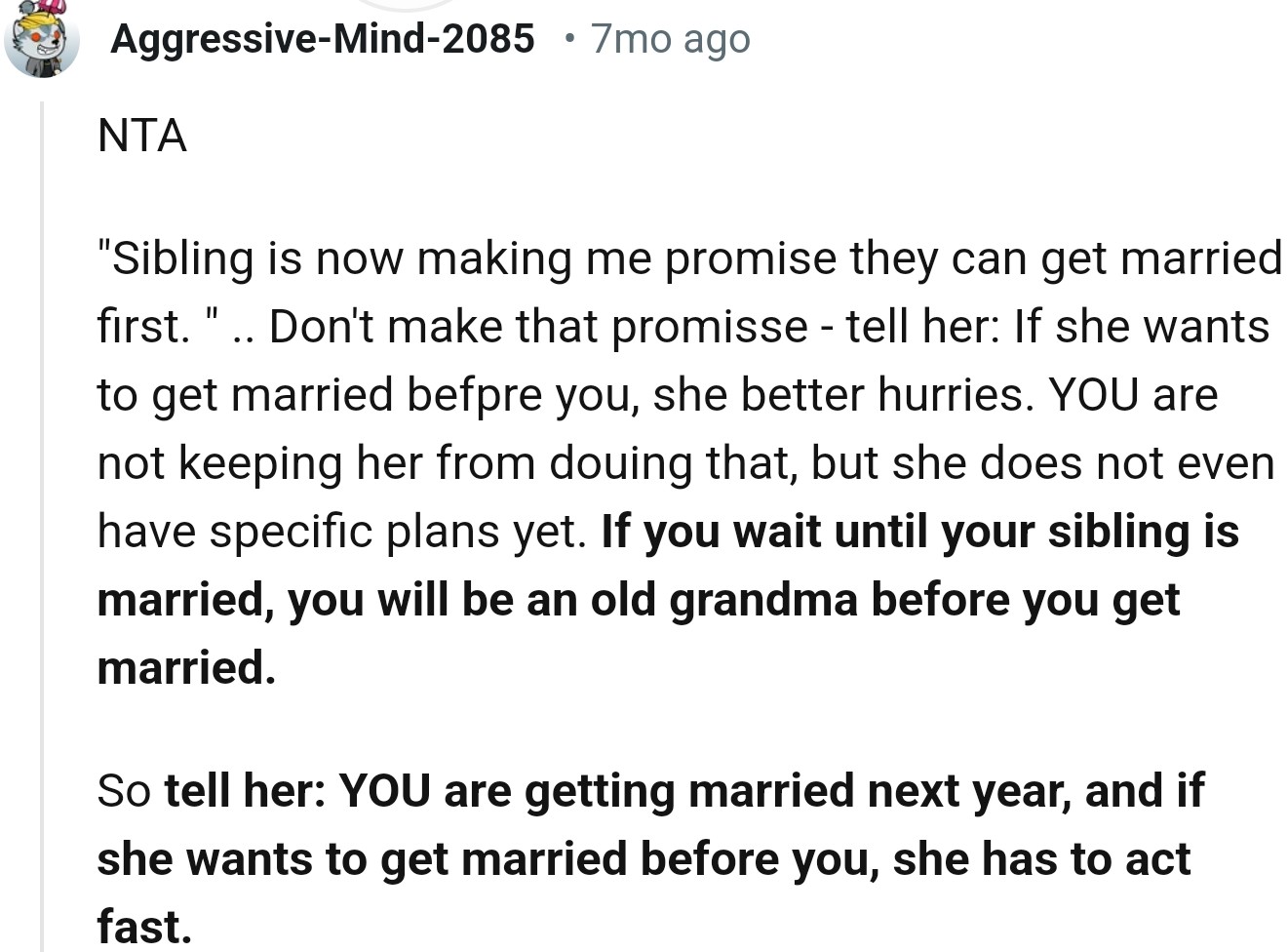 OP’s sibling wants them to put a hold on their upcoming wedding. Apparently, this sibling wants to get married first before OP