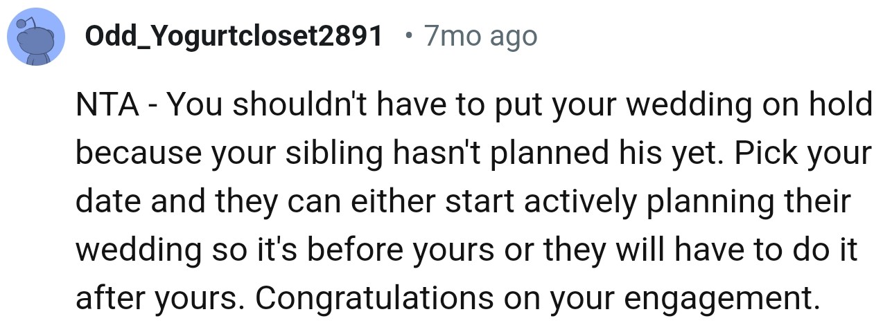 Their brother’s fiancée was suddenly all about planning their wedding and insisted on getting married first, as if it were some competition. OP was pretty chill about the whole thing; they agreed it made sense to space out the weddings for the sake of their big family.