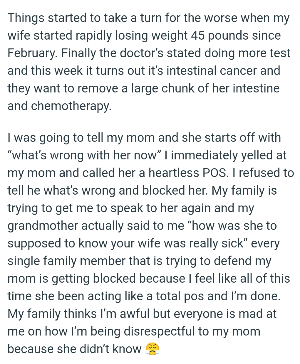 Things started to take a turn for the worse when OP's wife began rapidly losing weight. After many tests, it turns out it’s intestinal cancer, and they want to remove a large chunk of her intestine and administer chemotherapy.