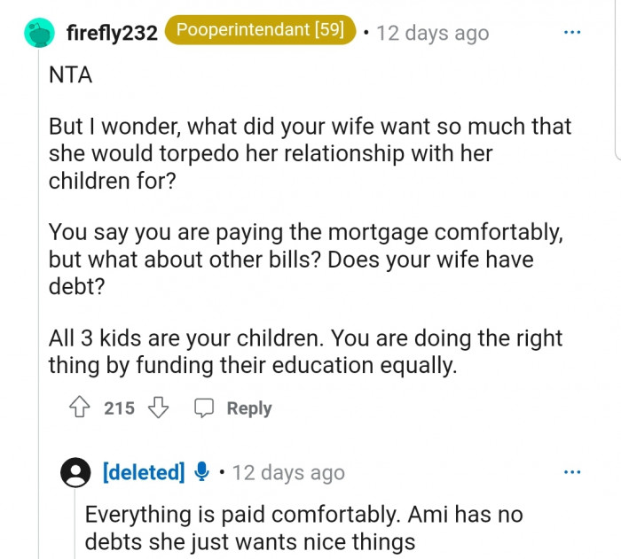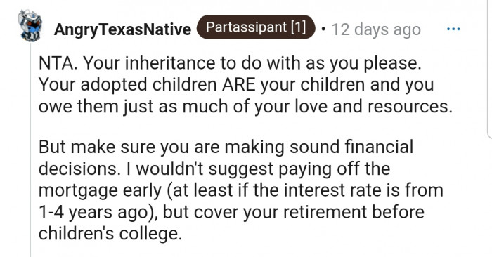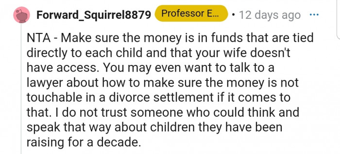 Many commenters also advised OP to look into securing the funds for the kids in case of his death or divorce. From the looks of things, all three kids have their futures secured, and college finances won't be a problem anytime soon.