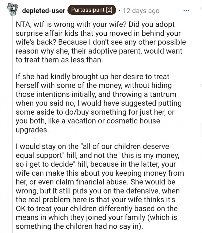 Now the problem is that OP's wife seems to be comfortable with the money allocated to their biological child but is upset that the same amount is going to their adopted children. In her opinion, their adopted kids should receive partial funding, while the rest of the money should be spent on her.
