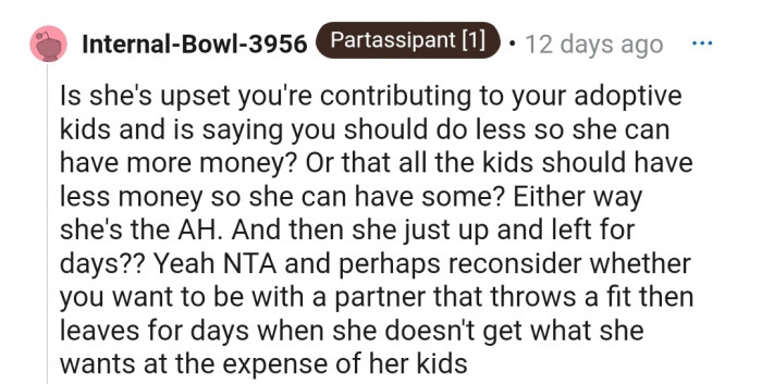 "Reconsider whether you want to be with a partner that throws a fit then leaves for days when she doesn't get what she wants at the expense of her kids."