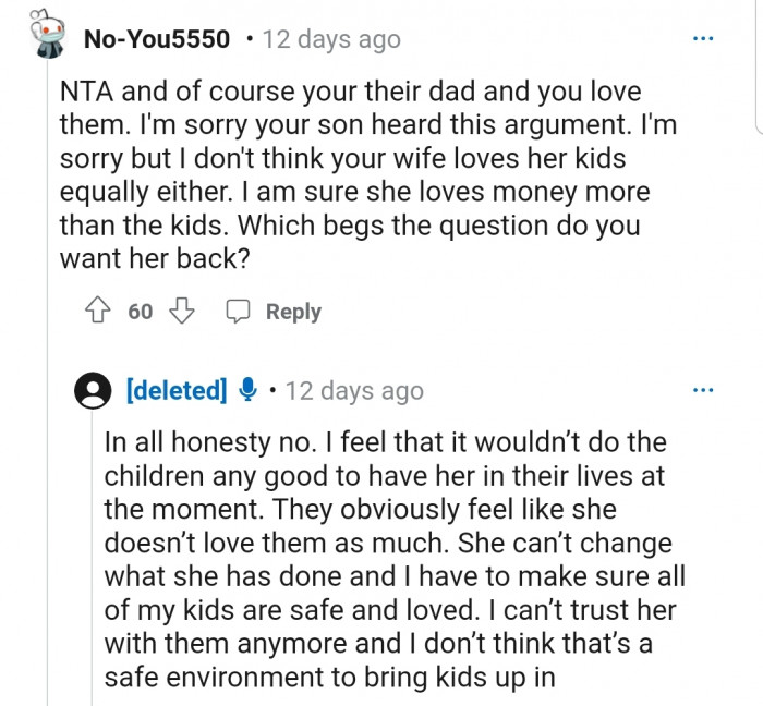 "I am sure she loves money more than the kids. Which begs the question: do you want her back?"