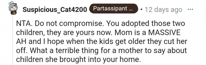 "She should not have adopted children if she couldn't treat them the same as her own biological children."