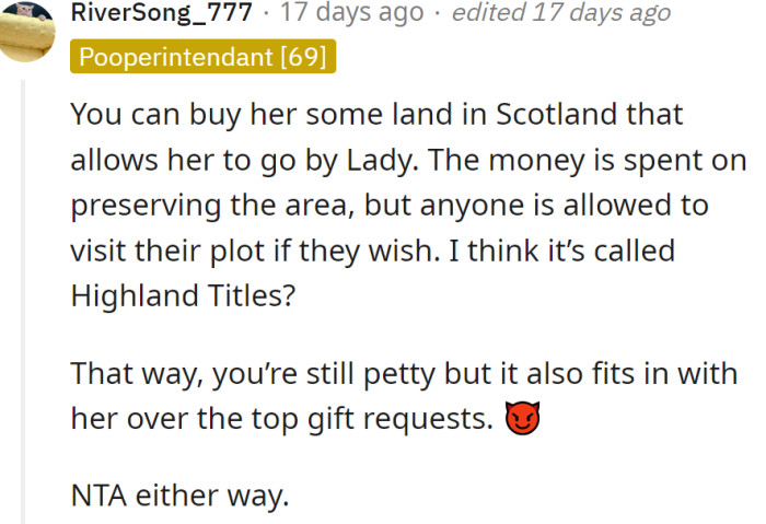 "You can buy her some land in Scotland that allows her to go by Lady."