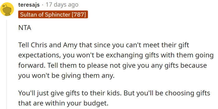 They also advised her to tell her brother and SIL that since they can't meet their gift criteria, they won't be exchanging gifts this year with them.