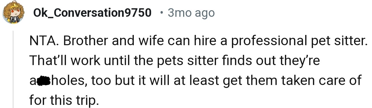 Apparently, her refusal sparked a huge fight. On the other end, OP’s brother called everyone under the sun to find a willing pet sitter but kept getting turned down.