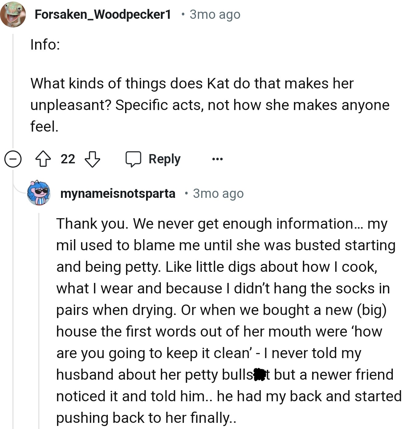OP's family has a strained relationship with OP's brother and his wife Kat, stemming from their mother's strong dislike for Kat.