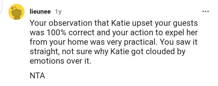 "Your observation that Katie upset your guests was 100% correct and your action to expel her from your home was very practical"