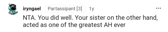The commenters unanimously believe OP is NTA. To them, that title should be reserved for OP’s sister.