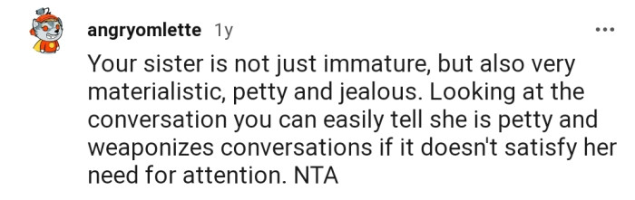 "Your sister is not just immature, but also very materialistic, petty and jealous"