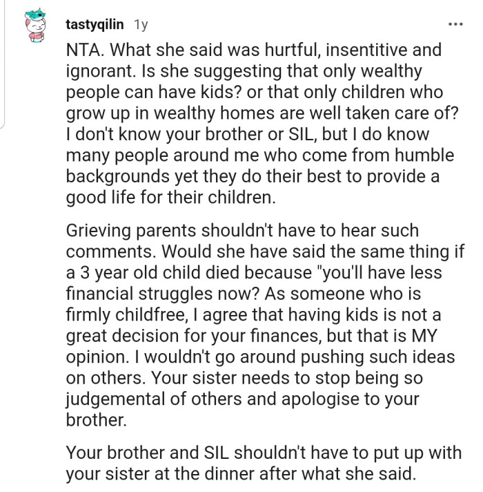 During the dinner, OP’s sister implied that having a stillborn was a blessing since OP’s brother and his wife were financially unstable. This hurt OP’s brother and shocked everyone present.