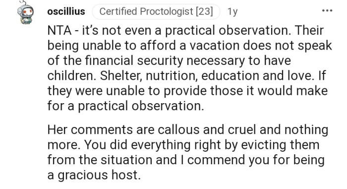 "NTA. What she said was hurtful, insentitive and ignorant. Is she suggesting that only wealthy people can have kids?"