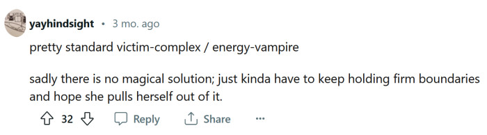 Ever since then, she has developed a bitter approach to life. She has remained single, without children, and finds it difficult to be happy for other family members who reach those milestones.