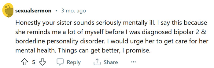Well, Reddit user u/Appropriate_Side_796 recently shared a story in the r/relationships subreddit about an issue she's having with her sister. The OP explained that she has always been protective of her older sister, especially since they lost their mother when they were very young.