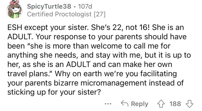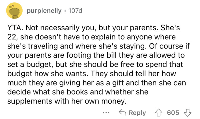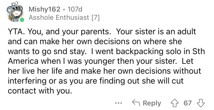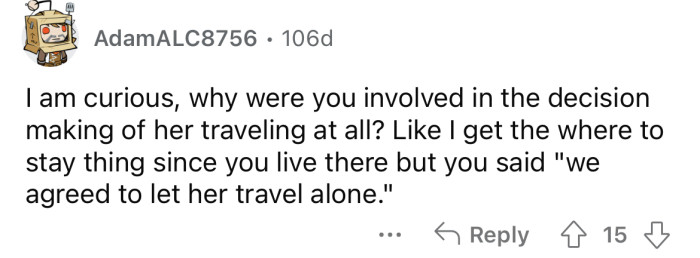 Reddit/la_cROAissantThe OP's sister reluctantly agreed to her parents' travel rules.
